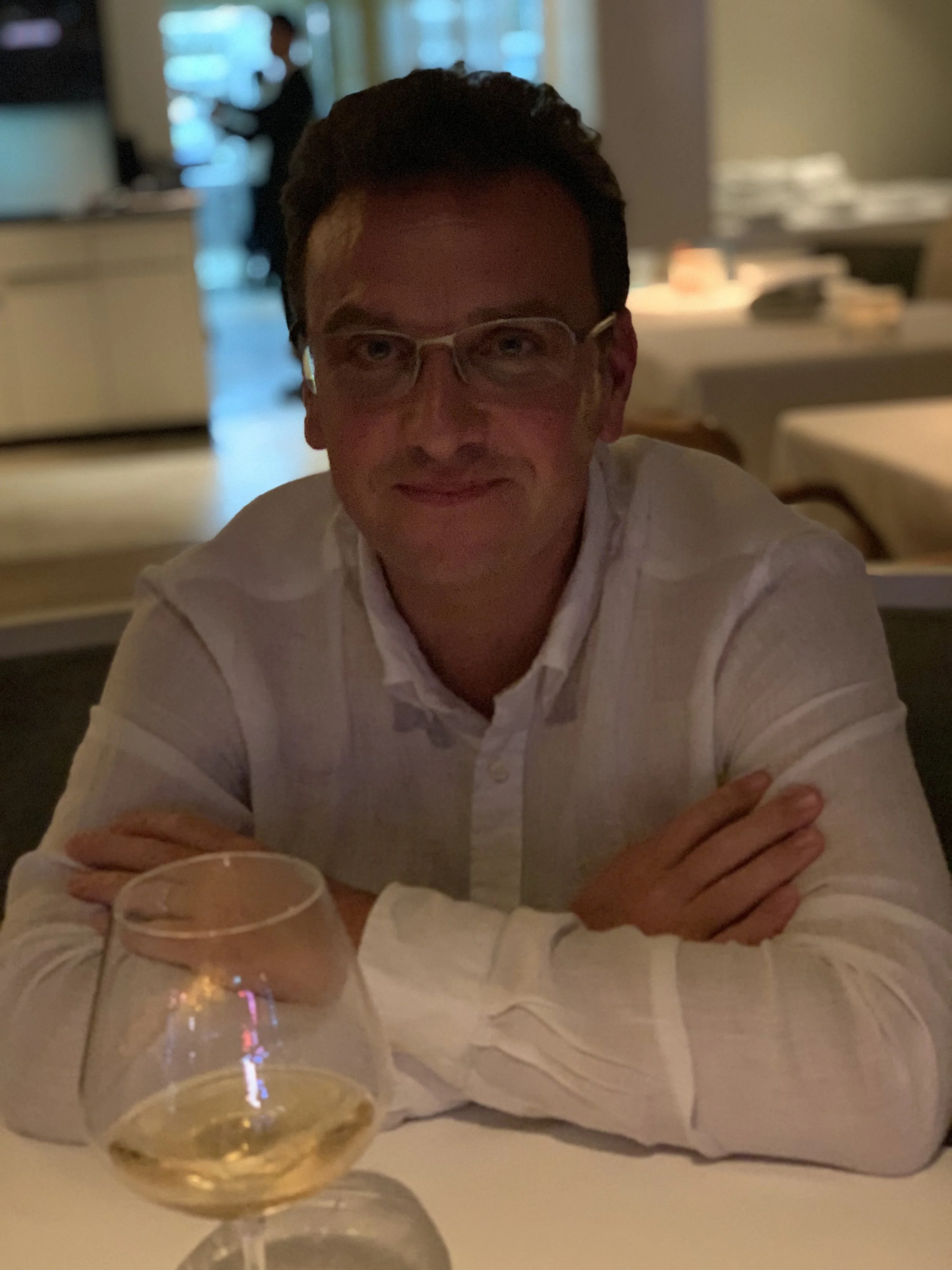 Man sitting in a dimly lit restaurant with a glass of white wine in the foreground.